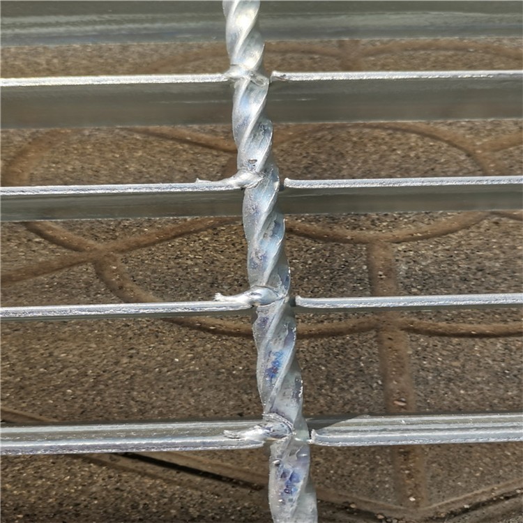 麻花钢钢格板制作方式:(麻花钢钢格板)有机器压焊和手工制作两种(麻花钢钢格板).机器压焊使用高压电阻压焊机,机械手自动将横杆横放在均匀排列的扁钢上,通过强大的电焊功率和液压力将横杆压焊入扁钢内,从而可以得到焊点坚固,稳定性和强度极高的高品质格栅板.手工制作的格栅板是先在扁钢上冲孔,然后将横杆放入孔中点焊。